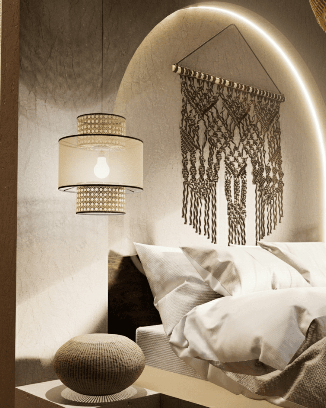 La luce gioca un ruolo centrale: l’illuminazione artificiale è studiata per essere morbida e diffusa, con corpi illuminanti decorativi che generano ombre leggere e contribuiscono a un’atmosfera accogliente senza appesantire la scena. La luce naturale viene invece valorizzata per esaltare le superfici e dare profondità allo spazio, mantenendo sempre una percezione luminosa e confortevole. Gli arredi su misura e le nicchie integrate organizzano lo spazio in modo funzionale, mantenendo un’estetica essenziale ma ricca di dettagli. Il risultato è una camera equilibrata, pensata per favorire il relax, dove l’aspetto emozionale dello stile boho si unisce a una progettazione attenta, coerente e senza eccessi.