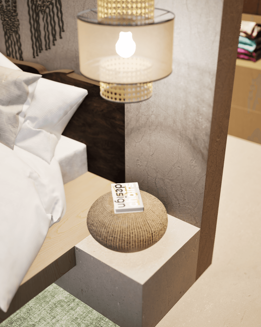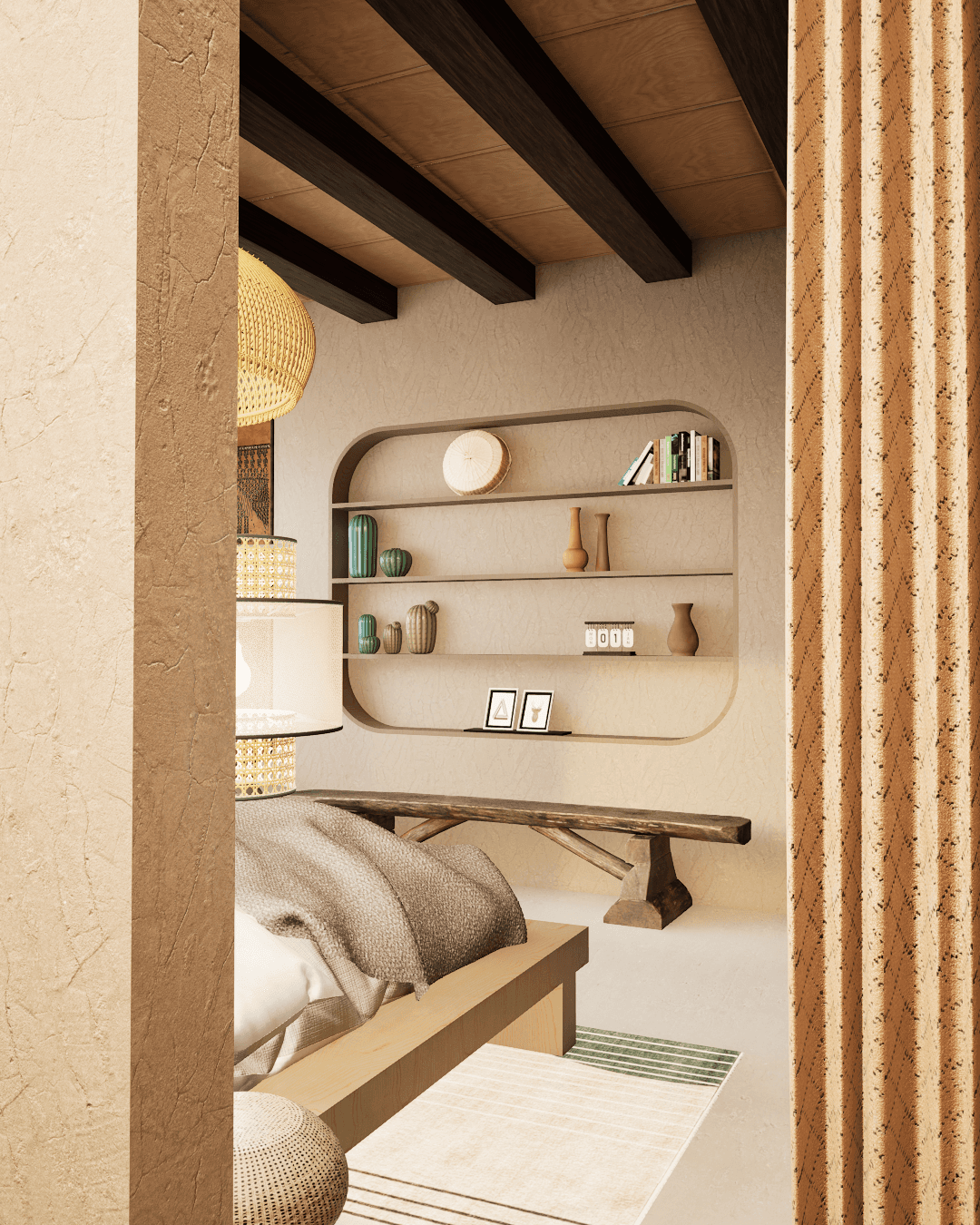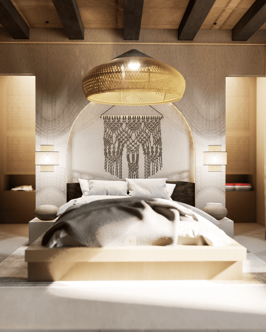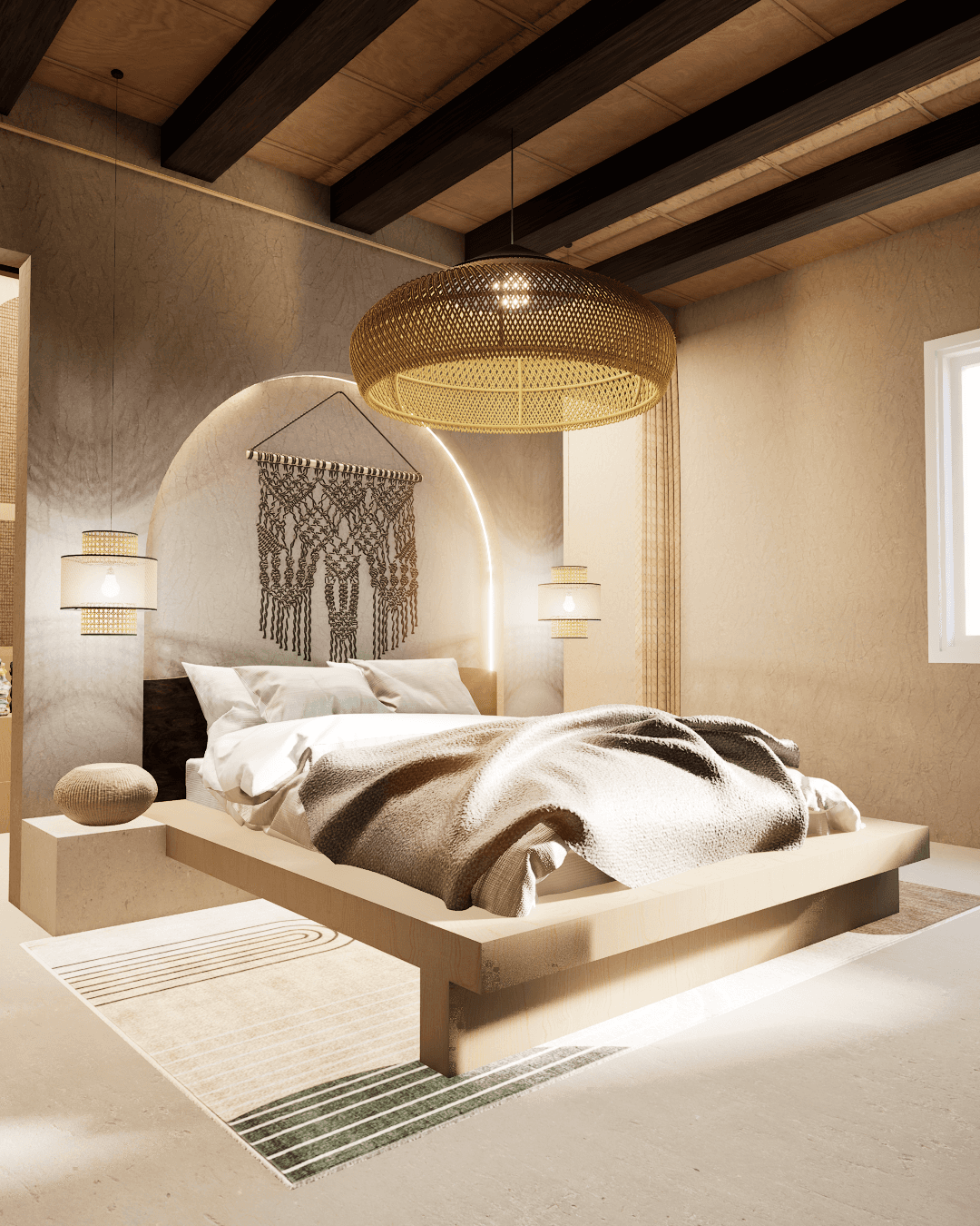 La camera è progettata come uno spazio intimo e avvolgente, ispirato allo stile boho reinterpretato in chiave contemporanea. L’idea progettuale nasce dalla volontà di creare un ambiente caldo e rilassante, in cui materiali naturali, texture materiche e una palette neutra dialogano in modo armonico.